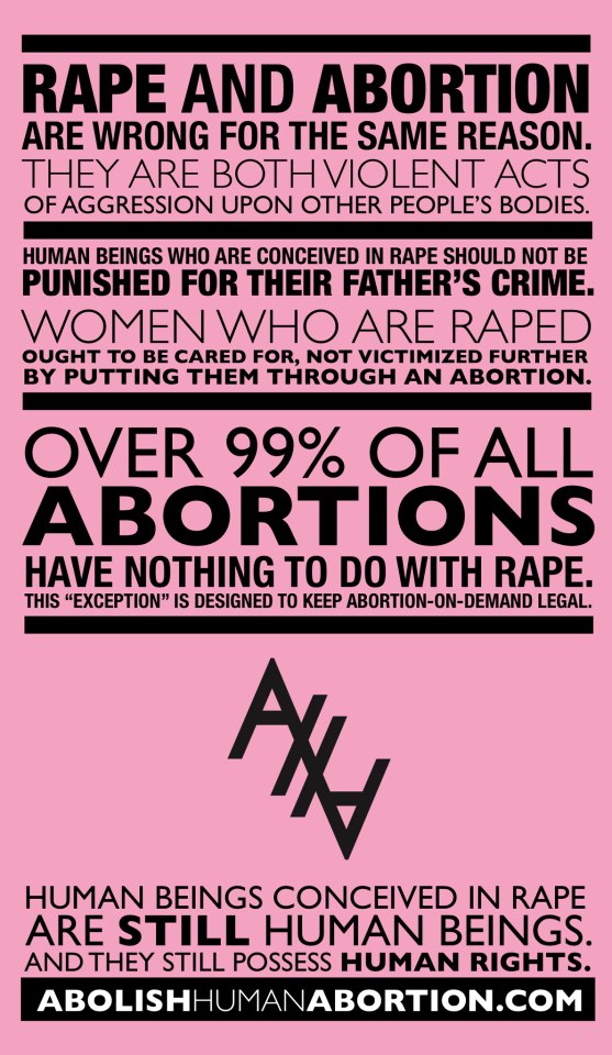 I recognize that abortion, and particularly in the case of rape, is a very emotionally charged issue. But I believe deeply in the protection of all life, and I do not believe that harming another innocent victim is the right course of action. (source)