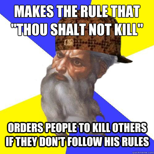 This meme goes in the second group. I would like to point out that it is exactly the same category error discussed with the Scumbag God meme: a failure to distinguish between “kill” and “murder.”