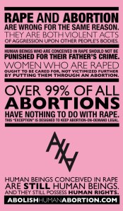 Now on with the real issue. Viewing this from a pro-life standpoint, abortion is morally wrong; it is murder. In that light, when aborting a child conceived in rape, you punish the innocent child for the crime committed by the rapist.